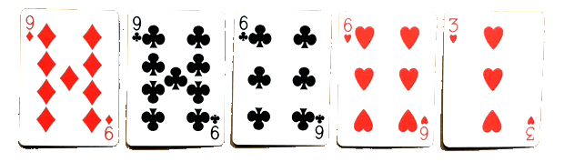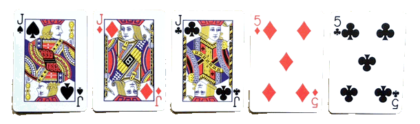 Main pleine (Full) : une main de trois cartes de la même valeur (brelan) et d’une paire